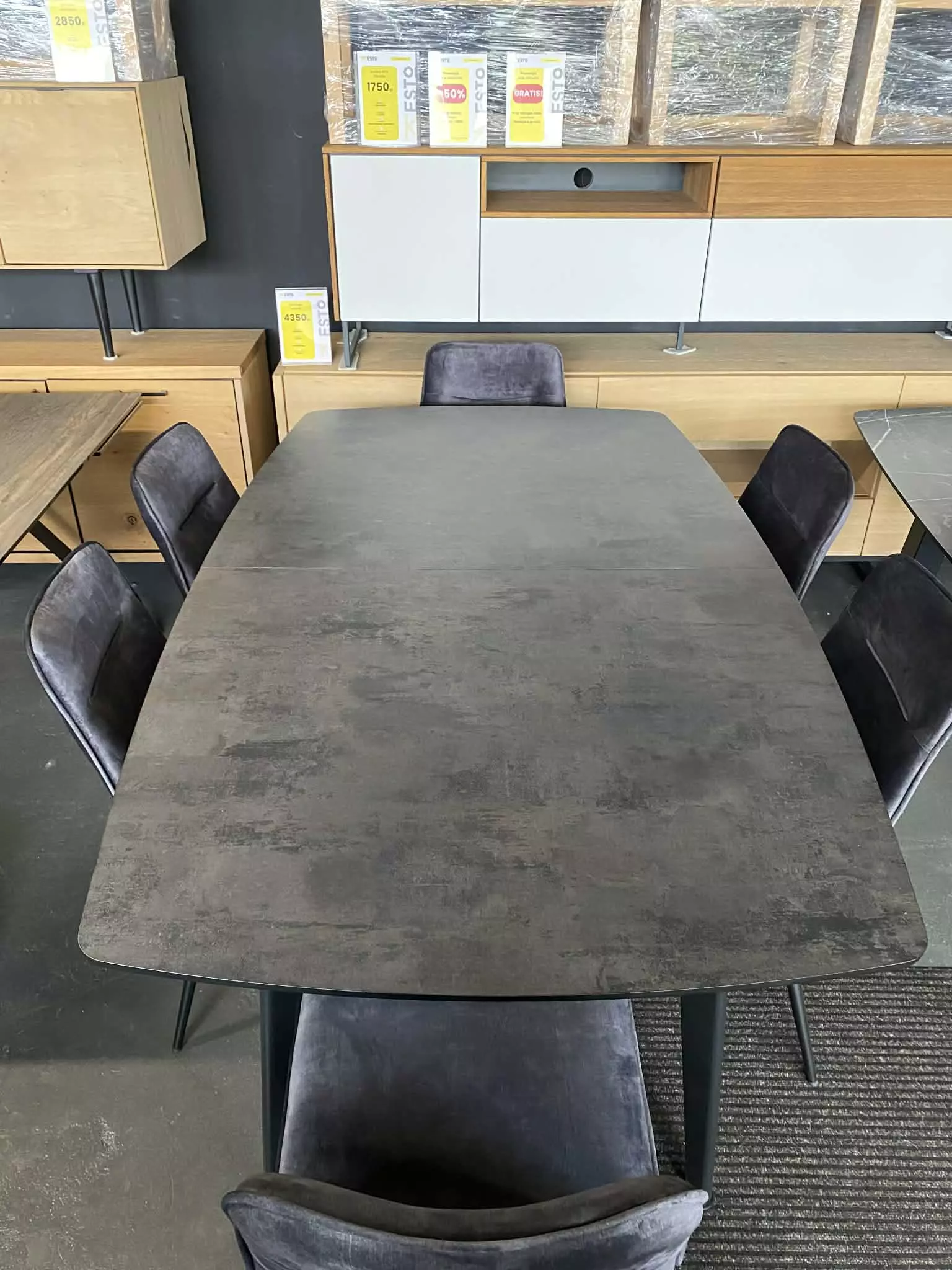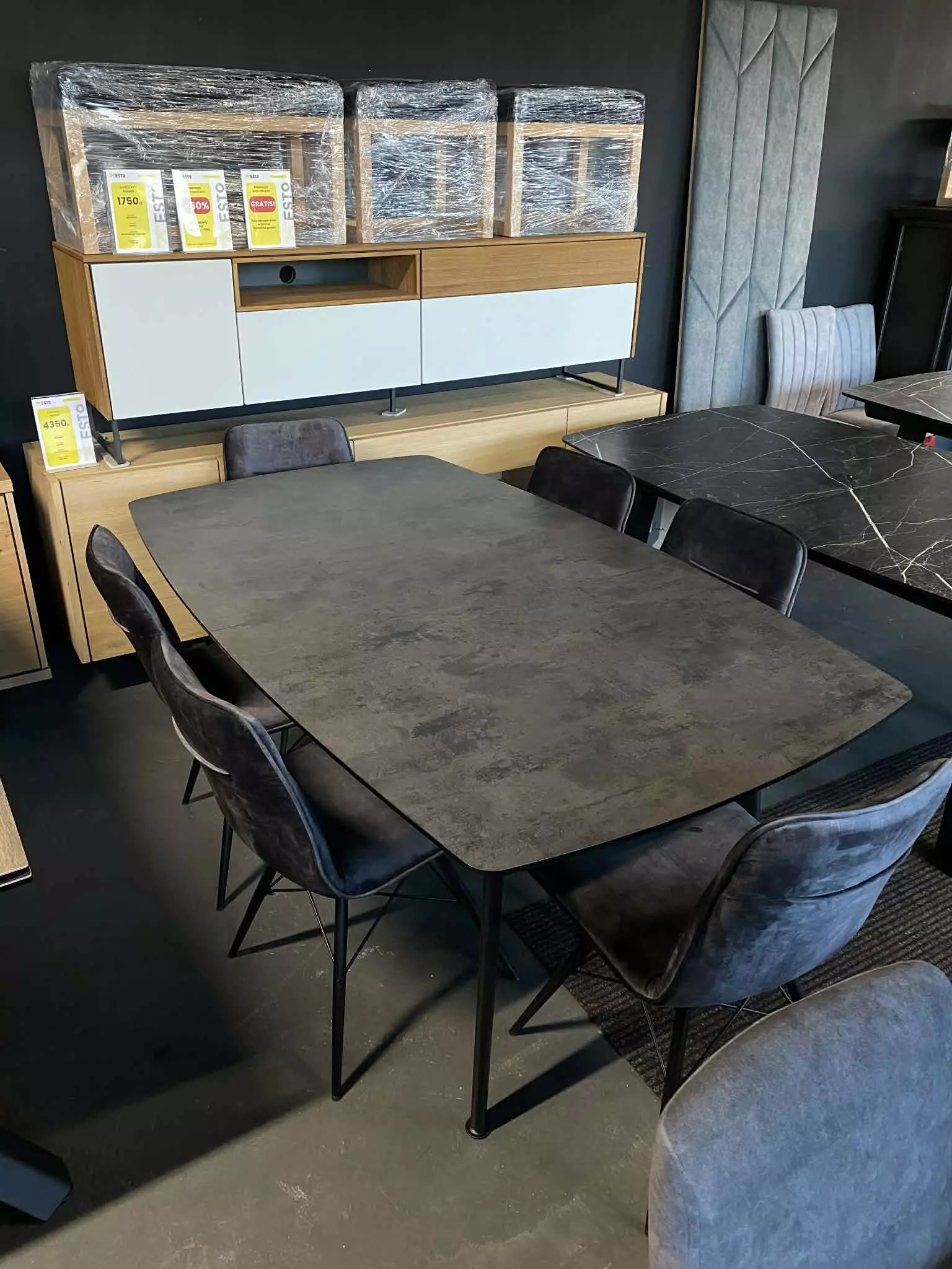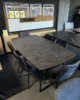 Blat wykonany z niezniszczalnego materiału Primo Laminato (HPL) o strukturze antracytowego marmuru łączy luksusową estetykę z odpornością na codzienne użytkowanie. Stalowe nogi malowane proszkowo, dostępne również na nodze typu pająk.