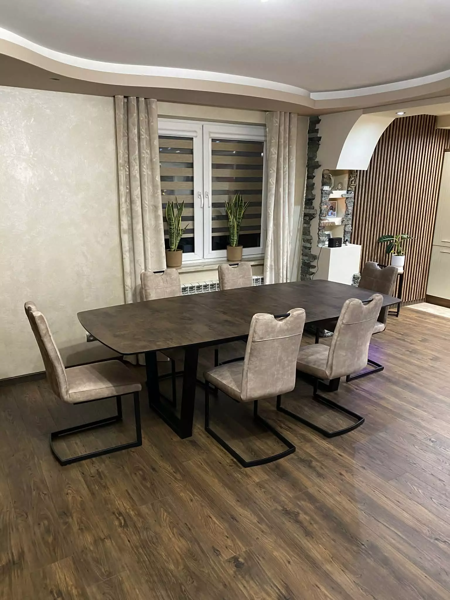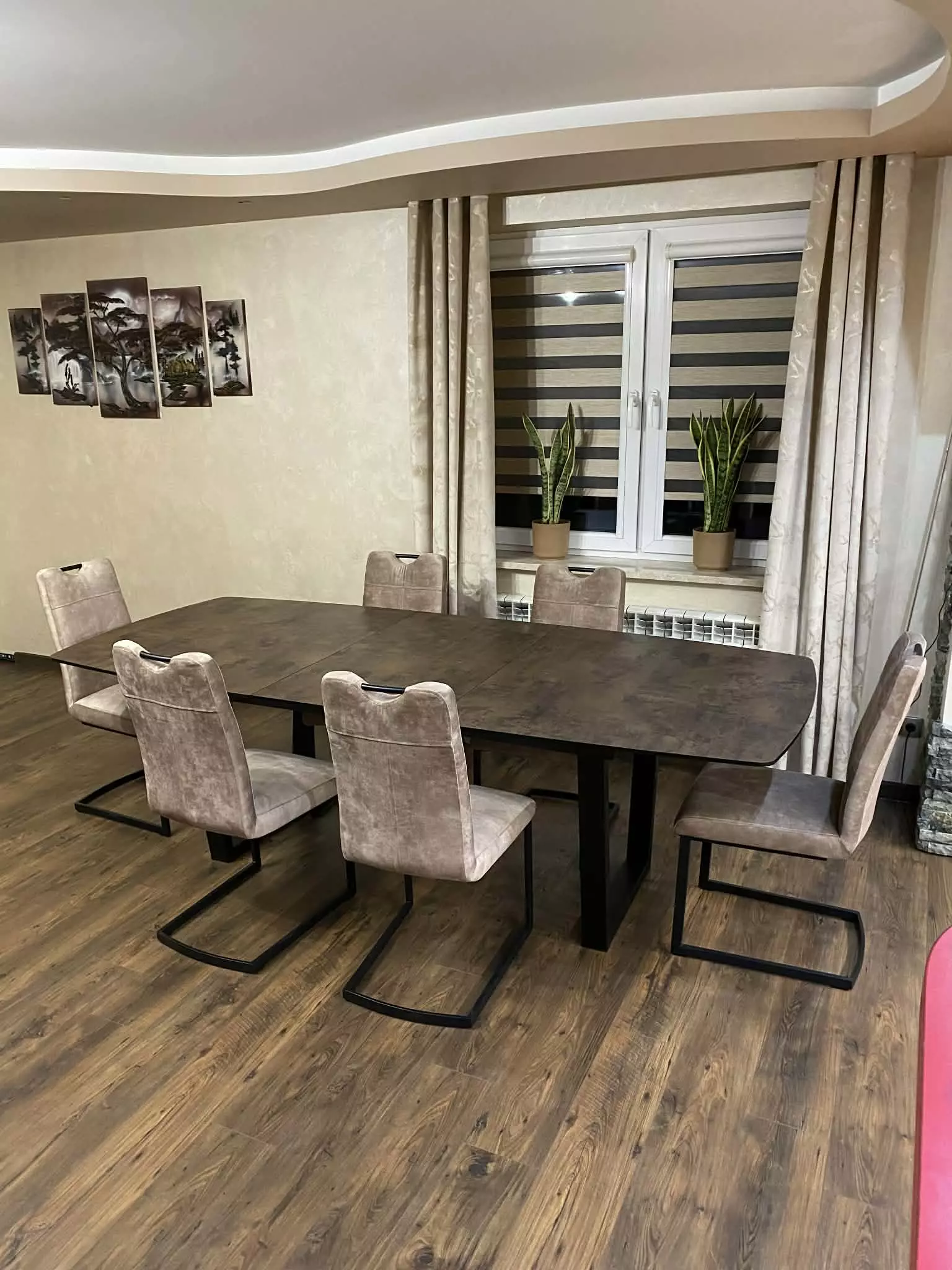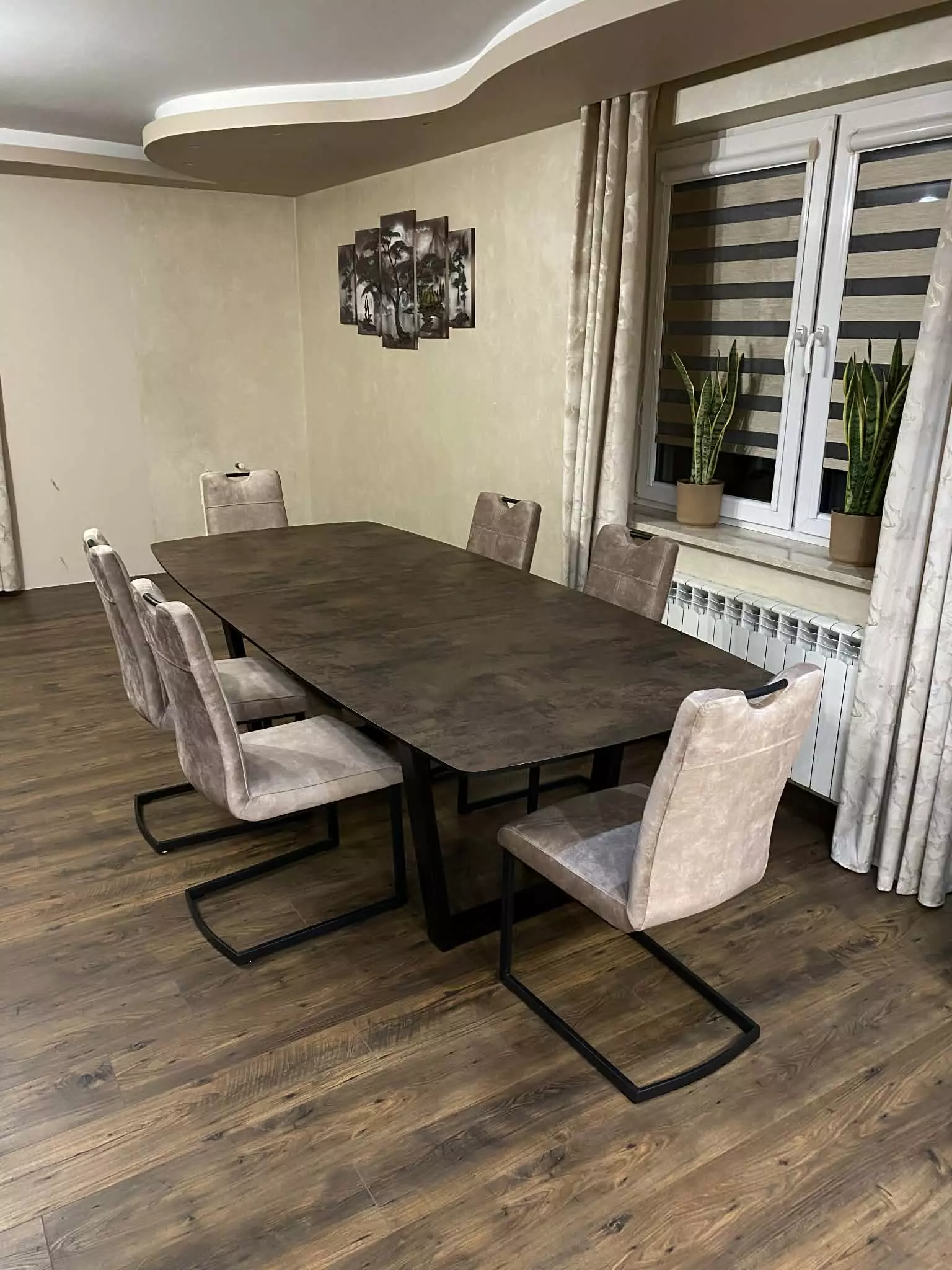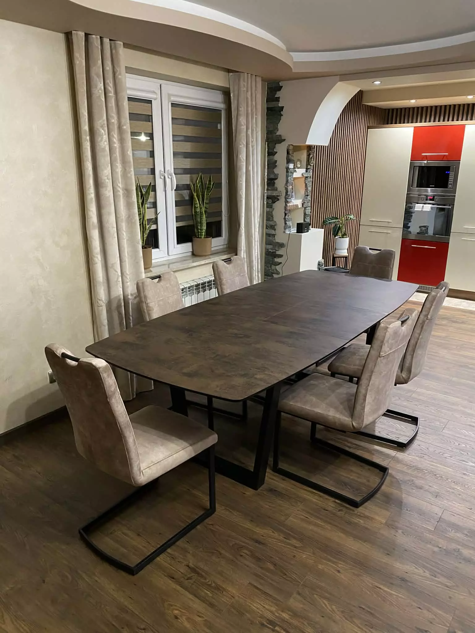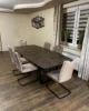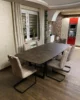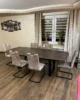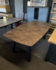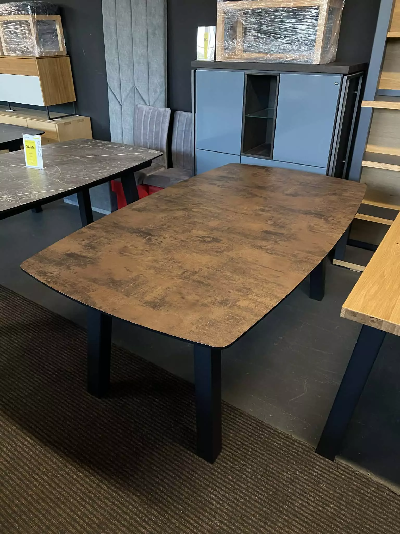 Blat wykonany z niezniszczalnego materiału Primo Laminato (HPL) o strukturze rdzawego marmuru łączy luksusową estetykę z odpornością na codzienne użytkowanie. Stalowe nogi malowane proszkowo, dostępne również na nodze typu pająk.